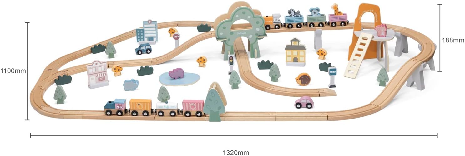- This 90 pcs train set consists of not only a modern passenger train but also a beautiful cargo train, many farm blocks consisting of farm house, farm animals, a farmer, many trees and bushes as well as many city blocks of fire station, police station, school, grocery store, a fire fighter, a police man, a fire truck, a police car, a school bus, and some traffic signs. The rails are made of high quality beech wood.